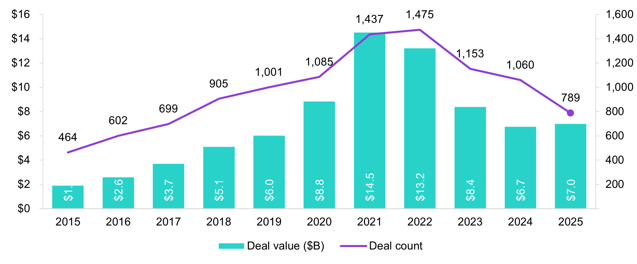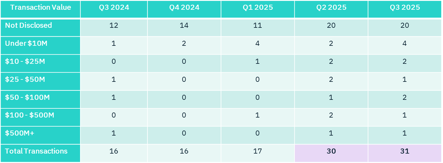 Deal count picked up in 2025 after a slow start, with Q3 reaching 31 deals, up 82% from Q1. We note that most of the deal values were “not disclosed”, so we should be careful to draw firm conclusions. However, the majority of deals with disclosed values were under $25 million, leading us to suspect that most of the undisclosed numbers were also of modest size.