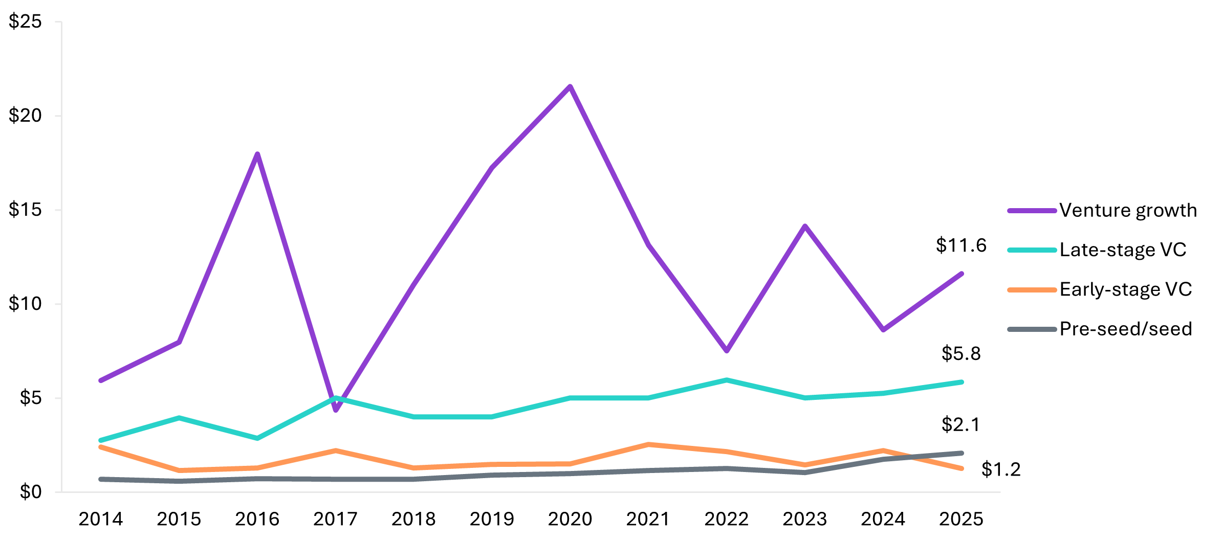 Figure 2, which has data through Q3, supports that view. Round sizes for late-stage and growth investments rose in 2025, while early-stage rounds have shrunk.