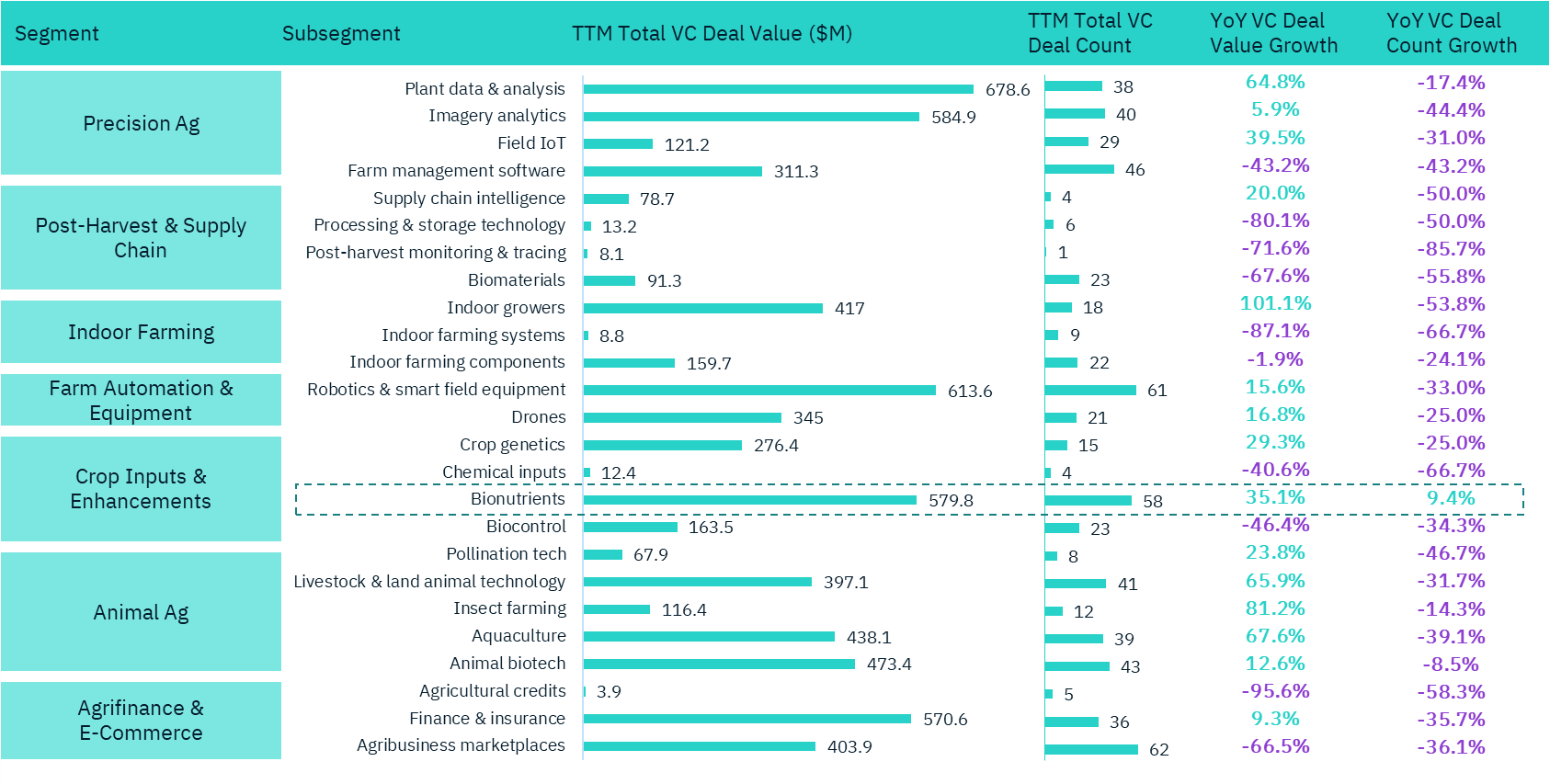Bionutrients is the one category where both deal volume and deal value have increased. We think that it is an indicator that the sector is coming of age. Ultimately, successful companies improve profitability for the farmer. We’re seeing more biologics companies – often in conjunction with precision farming soil and crop analytics – demonstrate consistently strong economic benefits. That bodes well for the sector, although in classic venture capital fashion, it is highly likely that too much money has gone into too many companies. Consolidation is coming, and there will be companies that generate meaningful value, but not enough to justify the investment they have received. Where do we stand on that score and what does it imply for M&A in 2026?